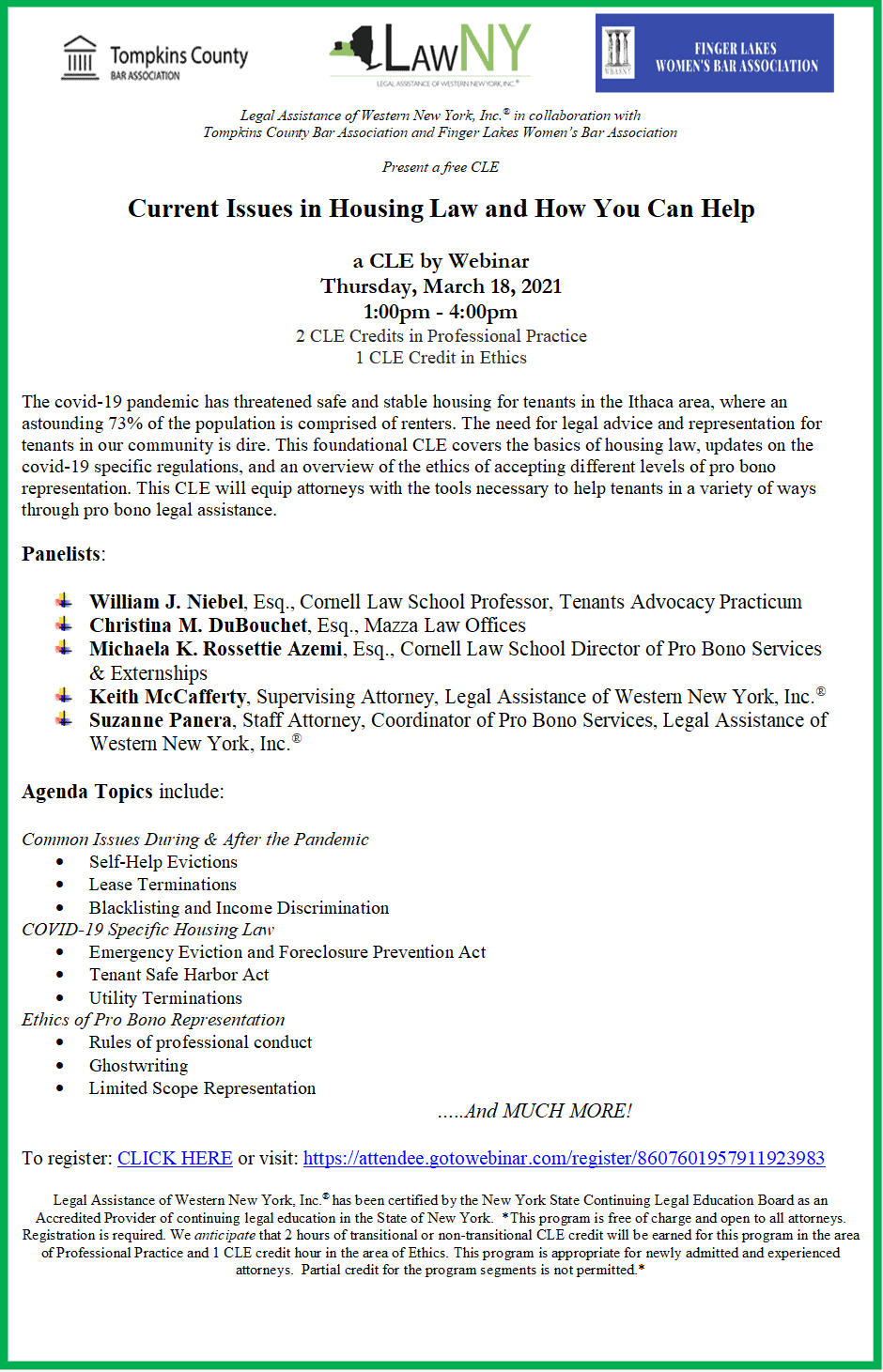 CLE: Current Issues in Housing Law and How You Can Help, Thursday, March 18, 2021, 1:00pm-4:00pm To register: CLICK HERE or visit: https://attendee.gotowebinar.com/register/8607601957911923983 tompkinsbar2021-02-19T11:27:04-05:00February 19th, 2021| Share This Story, Choose Your Platform! FacebookTwitterLinkedInEmail Related Posts Job Posting: Shaw & Murphy, PLLC – Associate Attorney Job Posting: Shaw & Murphy, PLLC – Associate Attorney April 7th, 2023 | 0 Comments Job Posting: Assistant County Attorney – Schuyler County Job Posting: Assistant County Attorney – Schuyler County March 21st, 2023 | 0 Comments Job Postings: Appellate Division, Third Department Job Postings: Appellate Division, Third Department February 3rd, 2023 | 0 Comments Job Posting: Seeking Operator of Mobile Litigation Station (Of Counsel / Part-Time Attorney Opportunity) Job Posting: Seeking Operator of Mobile Litigation Station (Of Counsel / Part-Time Attorney Opportunity) January 24th, 2023 | 0 Comments Notice Re: New York State Courts Electronic Filing Program Notice Re: New York State Courts Electronic Filing Program December 5th, 2022 | 0 Comments Notice of 2022 Annual Meeting Notice of 2022 Annual Meeting November 7th, 2022 | 0 Comments